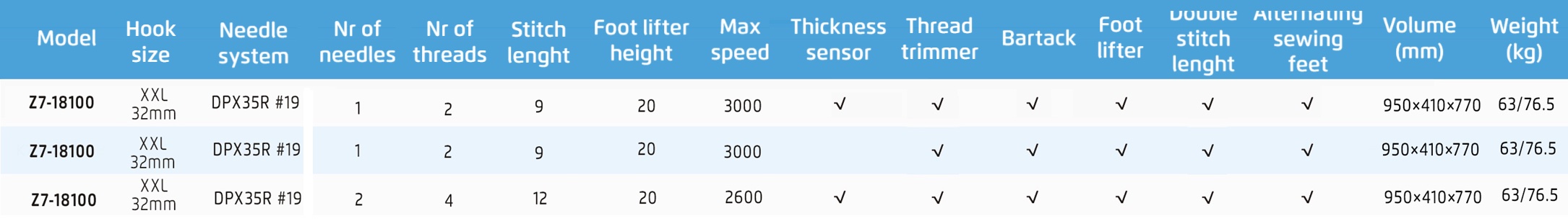 WHERE TO BUY LEAFLET Triple transport Machine with movement of feed dog, needle and feet specially designed to feed the heaviest materials such as automotive industry (steering wheels, seats, etc.), sofas, bags, mattresses. Artificial Intelligence AI chip instantly transmits thickness and resistance changes to the motor, thereby increasing penetration force and motor torque to perform further feed efficiency. Thickness Sensor When built-in sensor detects fabric thickness, automatically initiates second alternating sewing feet sewing and additional thread tension device to best perform whole seam. Double alternating sewing feet Two knobs set 2 interchanges system feet, to be activated automatically or manually according to overlapping or thicknesses detected. Additional thread tension device Second thread tension can also be activated automatically or manually according to overlapping or thicknesses detected. Double Stitch Length Corners sewing and similar seams, require decreasing stitch length: Jack Z7 automatically switches to the function by pressing a button without having to set the knob. Touch Screen Panel Voice guide and icons promptly,quickly and easily activate or deactivate functions such as backtack, presser foot lifter, thread trimmer and much more. Furthermore, by long pressing the button is possible to enter in function setting interface. Electronic Handwheel Micrometric adjustment setting by rotation of integrated digital handwheel. Half stitch with a simple click! Function keys The function keys are positioned on the head of the machine, one of which can be programmed as desired from the panel. 850W powerful motor The most powerful motor in its category: 13% more powerful compared to triple feed lockstitch brand competiros models! Pneumatic Presser Foot Lifter Equipped with double alternating pneumatic presser foot lifter. XXL Hook Thick thread and endless seams perfectly fit in 32mm hook size (+73% compared to the 2X hook type).
