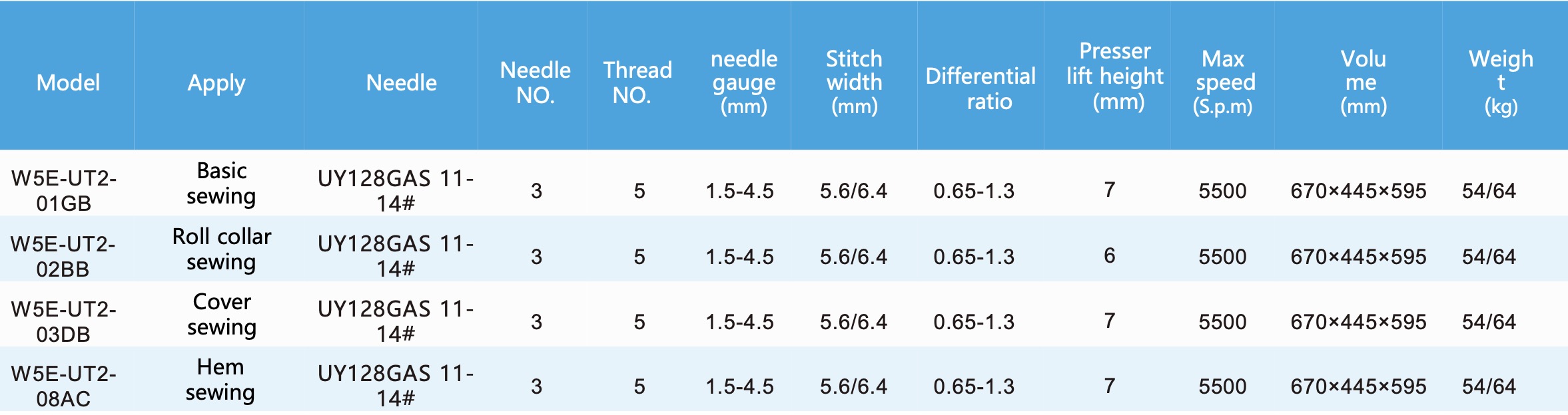 WHERE TO BUY LEAFLET Thread trimmer and thread catcher The upper thread trimmer and thread catcher work at the same time. High speed The speed of the W4S is 5,500 rpm, compared to the 3,700 rpm of a normal machine with cover, the efficiency increases more than 50%. Computerized with Voice Guide Using the machine it will teach you the various functions itself, if there are errors it will notify you and by clicking the VOICE button it will suggest how to solve the problem, furthermore with a single key you can return to the initial settings. Wide Adaptability Ability to sew on heavy, medium, light and mesh fabrics. Up to 8 layers of fabric thickness, without any adjustment, maintaining the beauty of the stitch. Standard (01) Collarect (02) Top stitching (03) Hem (08) Trausers pairing (F) 1-needle chain stitch machine with thread trimmer, thread wiper, puller, differential feed and submerged table. Discover more Specs